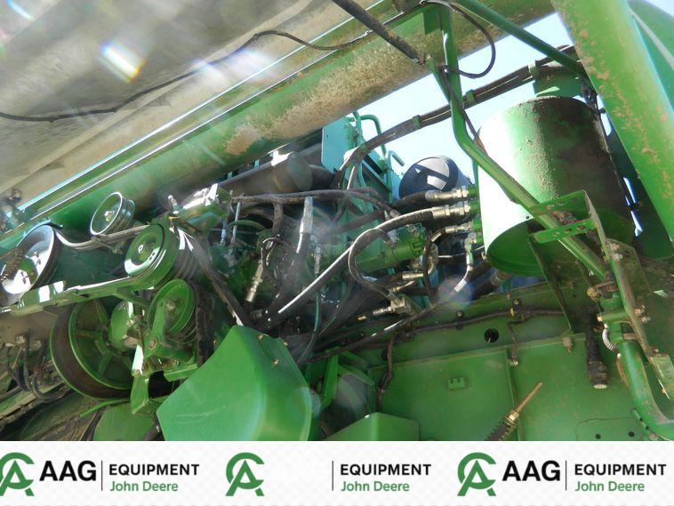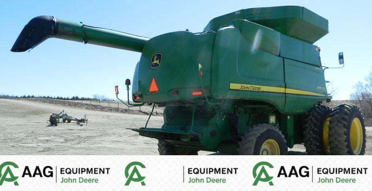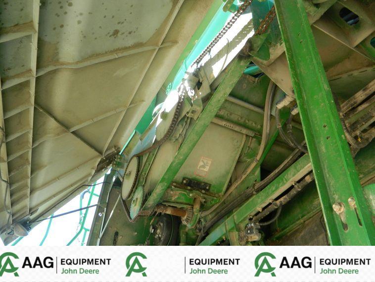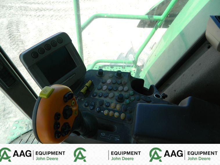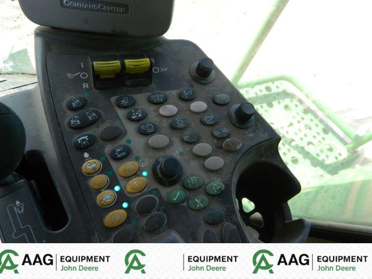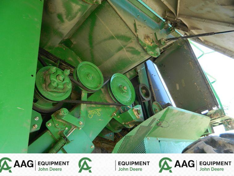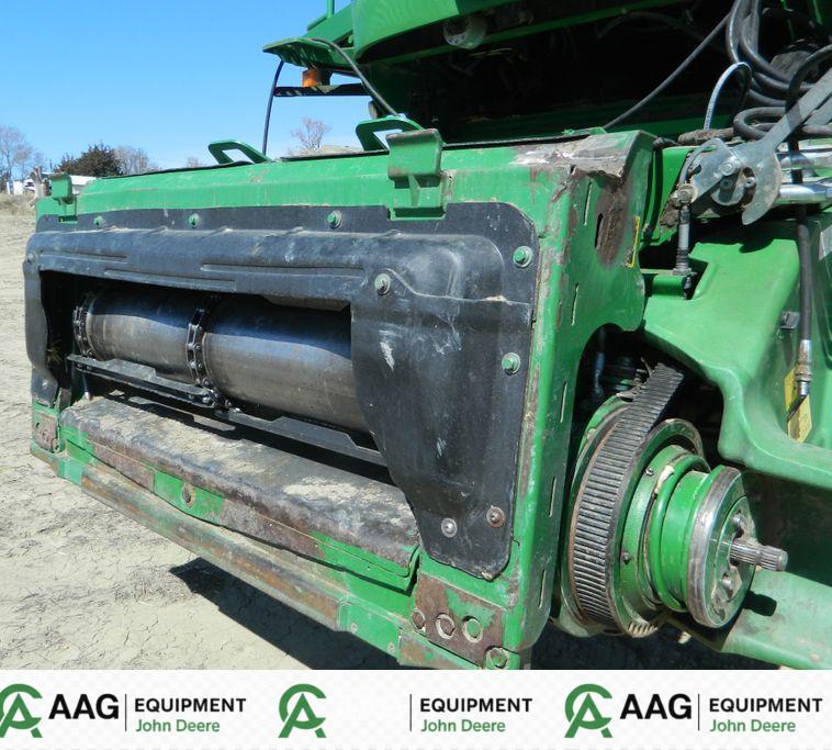 2010 John Deere 9770 STS combine with 3,376 engine hours and 2,296 separator hours. Powered by a 6-cylinder John Deere diesel engine and hydrostatic transmission. Cab equipped with heat and A/C for operator comfort. Operational features include feederhouse with reverser, lateral tilt, and variable speed, concaves (round and small wire), straw chopper, power tailboard, grain bin extensions, and a 22′ unloading auger. Riding on dual 520/85R42 front tires and 18.4R26 rears, this machine is field-ready for efficient harvesting.