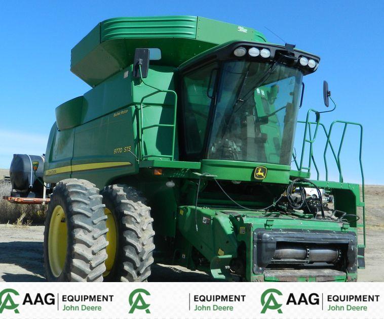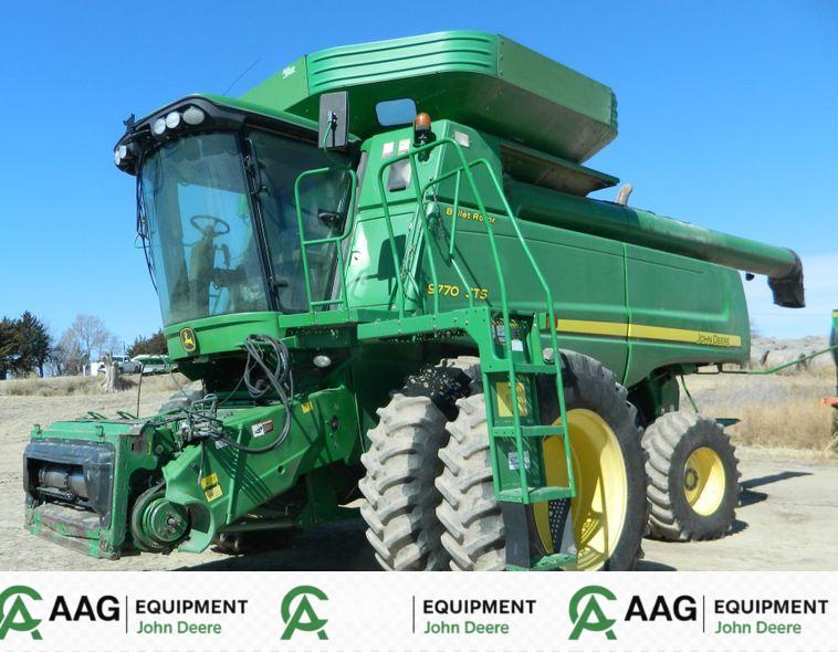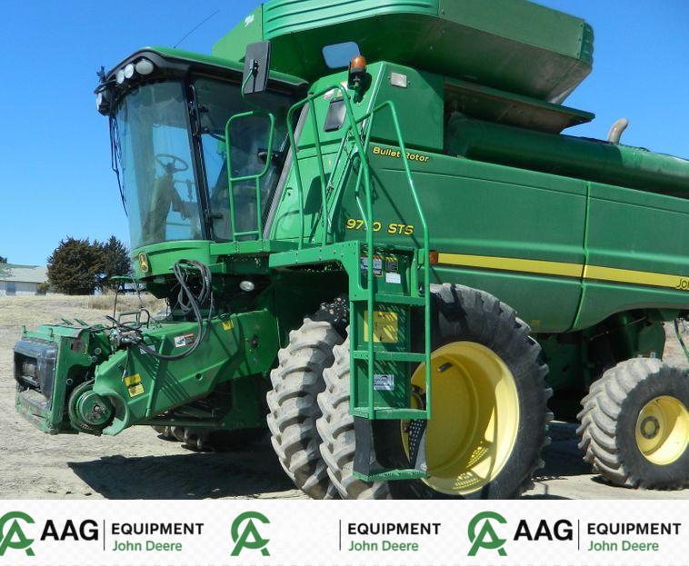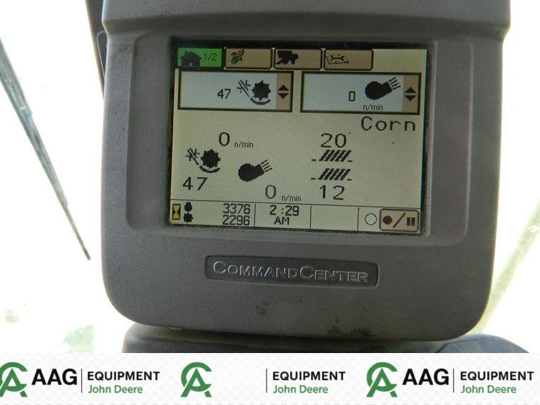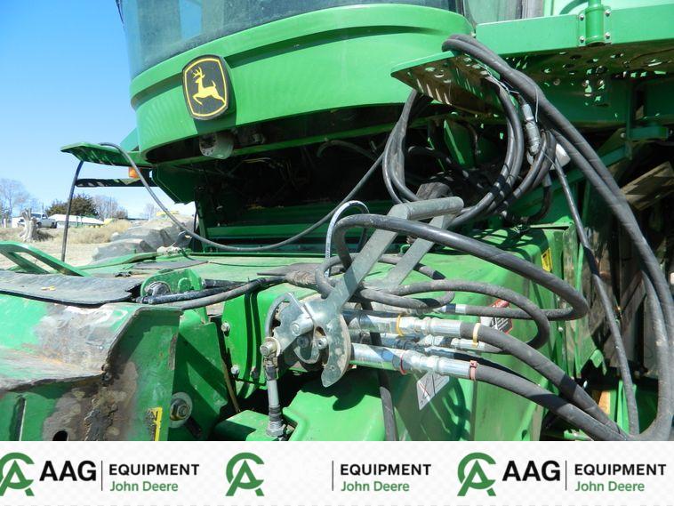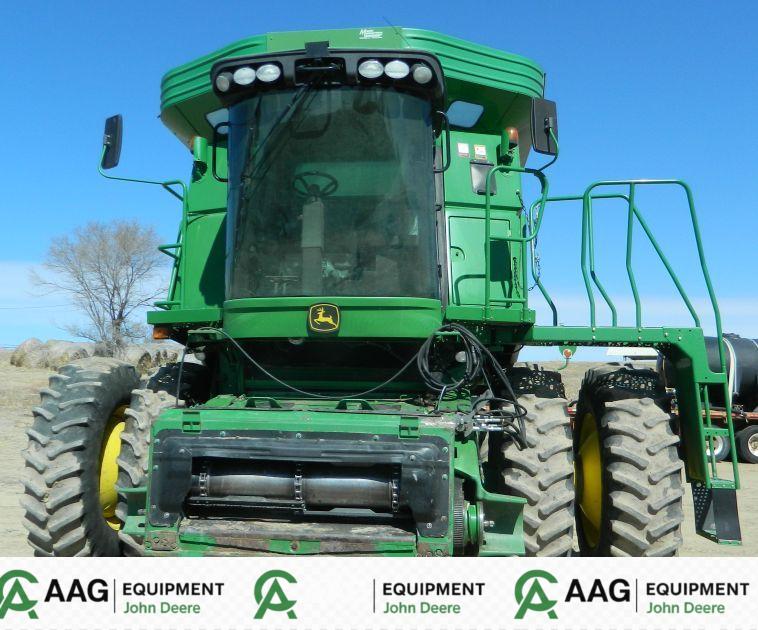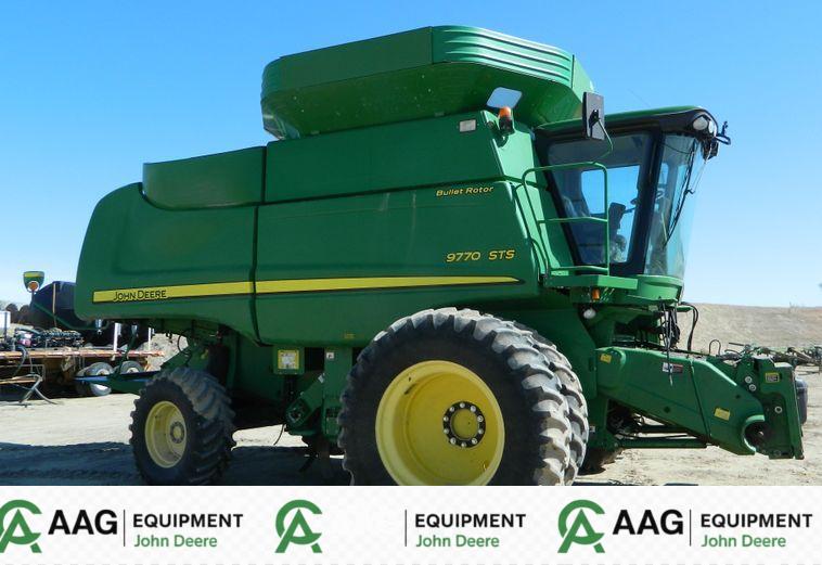 2010 John Deere 9770 STS combine with 3,376 engine hours and 2,296 separator hours. Powered by a 6-cylinder John Deere diesel engine and hydrostatic transmission. Cab equipped with heat and A/C for operator comfort. Operational features include feederhouse with reverser, lateral tilt, and variable speed, concaves (round and small wire), straw chopper, power tailboard, grain bin extensions, and a 22′ unloading auger. Riding on dual 520/85R42 front tires and 18.4R26 rears, this machine is field-ready for efficient harvesting.
