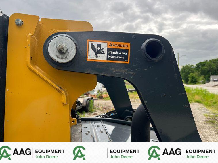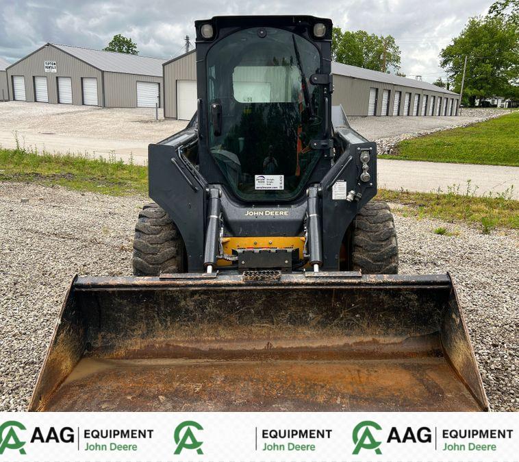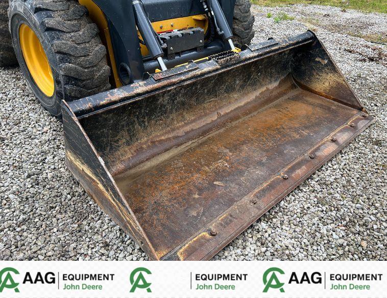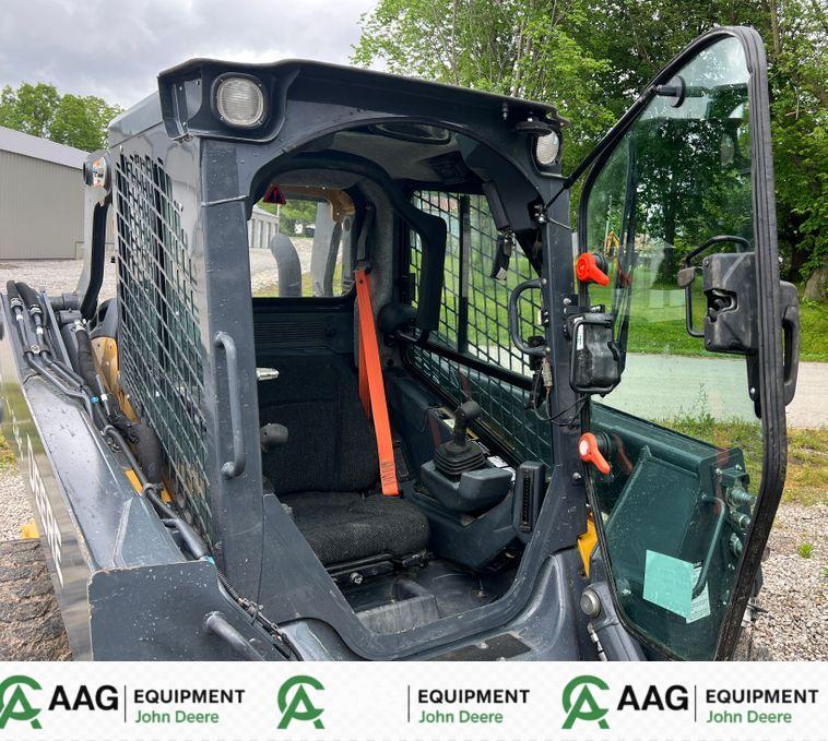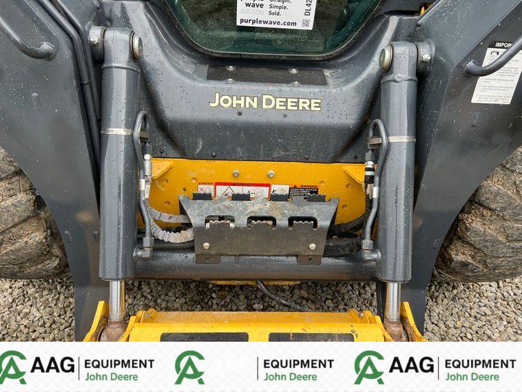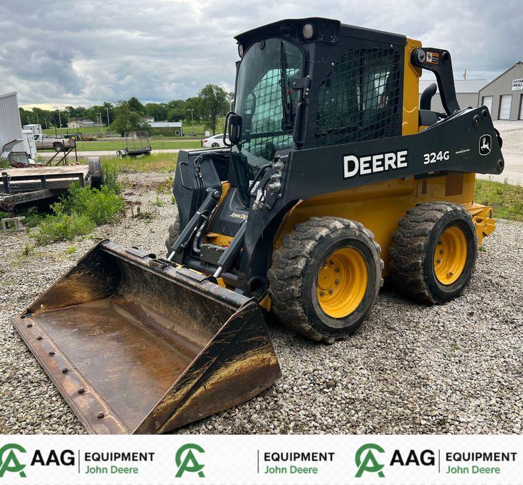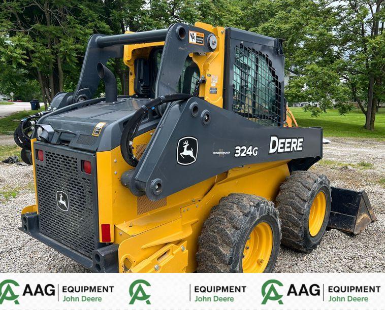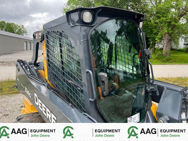2019 John Deere 324G skid steer loader with 275 hours (still in use, hours may vary). Powered by a 74 HP 4-cylinder Yanmar diesel engine and hydrostatic transmission with two-speed travel. Enclosed cab equipped with heat, A/C, hand controls, pattern changer, electronic monitoring system, and backup camera. Features include auxiliary hydraulics, auxiliary electrical outlet, hydraulic quick coupler, and counterweights. Comes with John Deere C84 84″ bucket with bolt-on cutting edge. Tires: 12-16.5NHS Camso. A powerful, versatile machine ready for demanding jobsite applications.